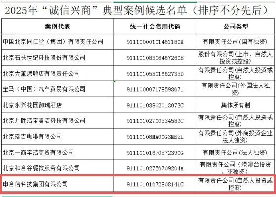 近日,为深入贯彻党的二十大和二十届二中、三中全会精神,落实《中共中央办公厅 国务院办公厅关于健全社会信用体系的意见》文件要求,北京市商务局组织开展了2025年"诚信兴商"倡议企业和典型案例征集活动。经过激烈角逐和严格评审,北京专精特新企业商会理事单位申合信集团凭借卓越的商业信誉和诚信经营实践,与北京同仁堂、物美集团、张一元、京客隆等京城知名商业标杆企业一同入选北京市"诚信兴商"典型案例。